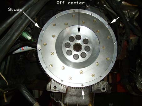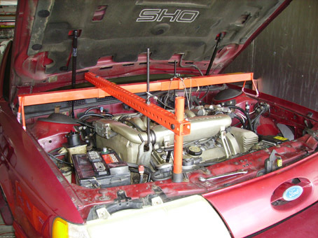 things in/out of place. And for therapy -Some penetrant and engine cleaning sprays. I used PB Blaster and Gunk Engine Brite. -Loctite (Blue) for the flywheel and pressure plate bolts. -If you got a new flywheel, a vise is needed to drive pins into the flywheel. -At least 4 floor jacks (hydraulic and screw type), to support everything. 2 jackstands also. -A transaxle jack will be helpful, but is not necessary. -Block of wood to help support engine. -Some rope or wire (to support items while hanging). -Goggles, mask for eye and vapor protection. -Small pump for filling trans fluid. -Gloves and some clothes you don’t care about- you will get dirty. Repeatedly. -If you are unlucky (like me), and break the y-pipe studs: -Tap and die set, the studs are M10x1.50. -Drill and drill bits, to drill out old studs. -Compact cutting tool (a Dremel works well) to cut old studs off. Let’s begin: 1. Apply penetrating fluid to the y-pipe studs and let it soak overnight (raise car as needed). Lower driver side window (only if indoors). Disconnect negative battery cable and set parking brake. 2. Support the engine and trans: setup engine support carefully- the engine will be hanging over your body. Assemble support as per instructions. Front goes to the hanger bracket, rear goes to the EGR bung at the rear of intake (I found this location to work for me). Add the safety cables if so equipped-wrap them around intake tubes. Tighten both ends and make sure it is steady. Refer to the 2 photos below: