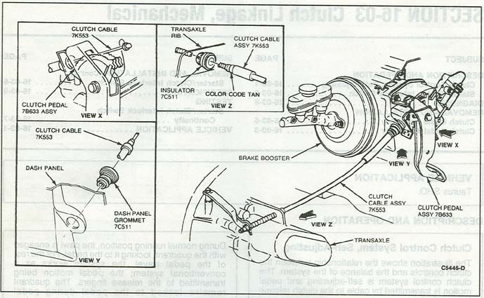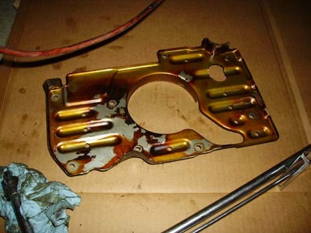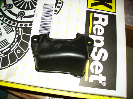 20. Unhook the reverse lamp switch from the top of the trans. 21. Loosen clutch cable. Have some one pull up on the clutch pedal and then pull the cable forward from the clutch fork. Gently release and let it hang out of the way. 22. If changing clutch cable: Refer to the 4 pictures below. Shield: ![]() Cables, old and new: