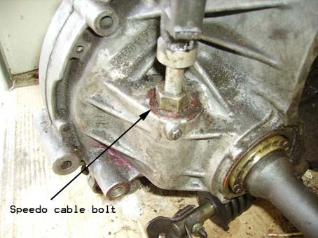 23. Loosen speedo cable by undoing the nut at the bottom (see picture). Let it hang out of the way. ![]() 24. Now for the fun part, removing the transaxle! Take a break first if needed.
