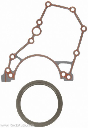 1. Seals: You may need to straighten out the carrier seal as it may have bent in shipment. Tap the new rear main in using the old seal-it should be flush or very close to flush- there is a stop at the end to stop it from going too far. Make sure it is even. Mount the carrier plate and rear main carefully, ensuring both seals seat properly. Oil pan- there are two gaskets at the ends and there is rtv gasket maker on the sides. Spread the rtv and then install the oil pan. Work quickly- the rtv will only take about 5 minutes to start setting! Pic 26-28: Rear main seal and carrier gasket. Pics are from RockAuto, I got their Felpro seals: ![]() Oil pan seal: