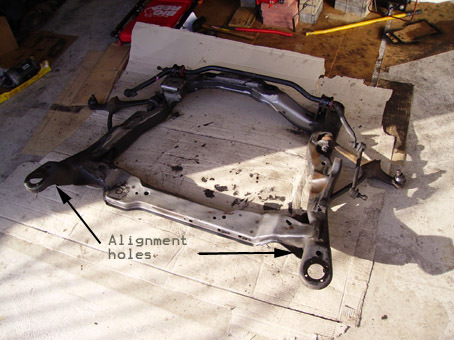 12. Remove the 2 oil pan-to transaxle bolts. Remove the plate if it doesn’t fall on its own. 13. Disconnect Engine mounts: Remove the front, rear and transaxle mount nuts/bolts. At the front of the subframe, remove screws that hold the steering fluid cooler from subframe and let it hang. Support engine under the oil pan. Use a screw jack and a block of wood. 14. Remove subframe. Be careful here- you do not want the engine to drop down! Place jacks at front and 2 rear corners. Loosen the 4 18mm subframe bolts. Slightly lower subframe (until there is a gap between the mounts and subframe) Slightly loosen the jack under the oilpan until you see a gap. You are looking for the engine to be suspended only by the top support- if it is not, and it just keeps moving down- raise subframe and oilpan jacks, and redo step 2. Once you are sure that the support is holding, remove the subframe bolts, lower subframe all the way (watch for any stuff you forgot to disconnect), then remove the jack under the oilpan. Drag subframe out of the way, preferably on cardboard or something similar. Put back the jack under the oilpan and support the engine. Pic 5:the subframe is out. ![]() You can now change sway bar bushings if you wish. I did.