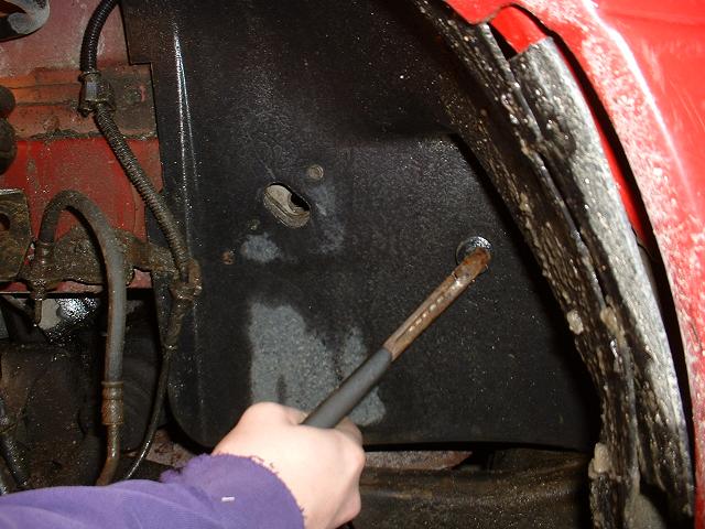 2. Remove splash shield. Unscrew the Phillips screws from around the edge, take out the few 8mm bolts, and pull out the plastic anchors. (Shown in this pic.)