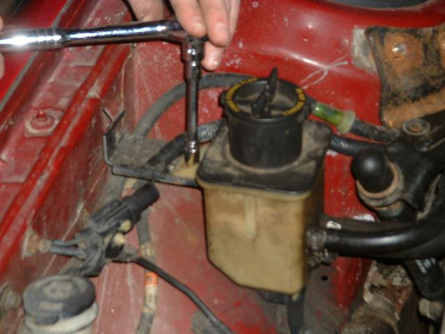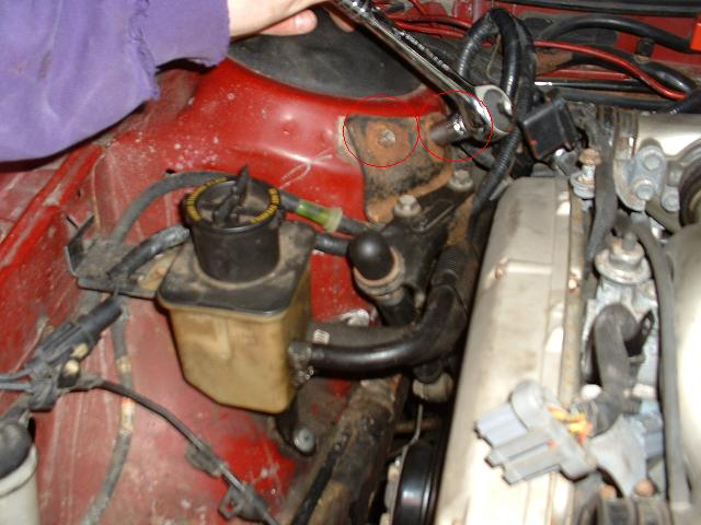 6. Remove engine roll damper. There are two 13mm bolts holding it to the bracket, 3 13mm nuts holding the bracket to the strut tower, and two 10mm bolts attaching the bottom of the damper to the block. First remove the damper itself, then the bracket. First remove the 8mm bolt holding the power steering reservoir down. This way you can move it as you need to to give yourself more room.