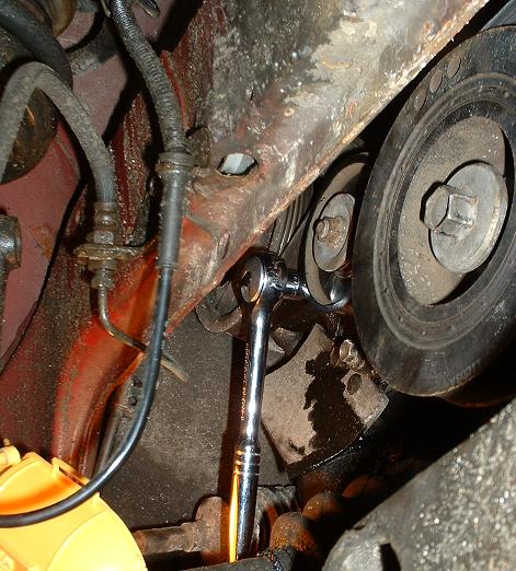 You'll need a long extension (18") to reach the tensioner, and it can be accessed through here. Alternately, you could use a small hex key and reach in there, but that would take forever! Not impossible though if you can't get a long enough extension. Also, in case you left the engine roll damper in place up to this point, there is a small cutout in the lower bracket that allows you to fit this extension through. This way you can tighten/loosen the belt even after everything is all back together.