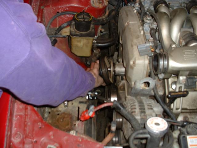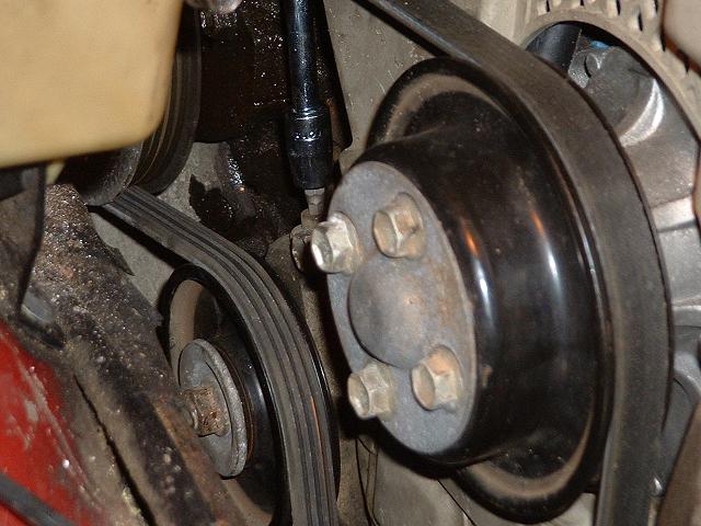 8. Before you take the next belt off, first remove the 4 12mm bolts holding the water pump pulley on. You need the belt on to do this, otherwise the pulley will just spin! Another option is to use a strap wrench after the belt has been removed.