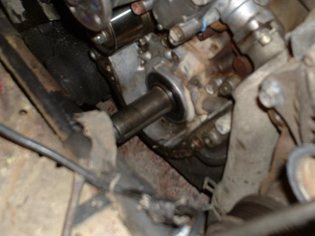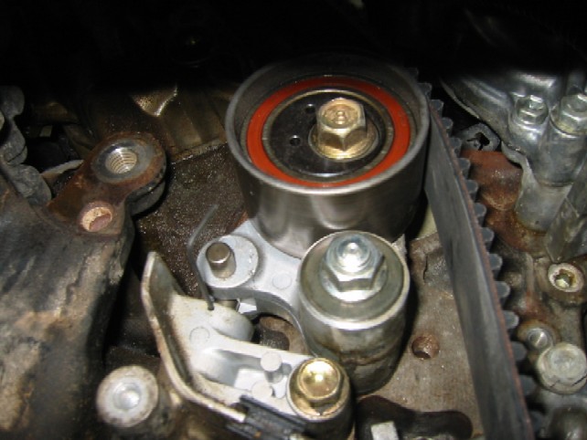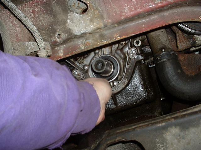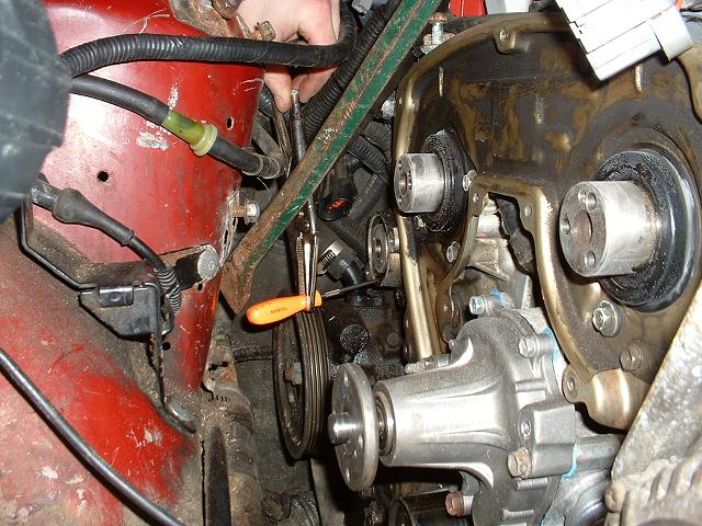 17. Remove the timing belt pulley. If you haven't removed the crank bolt yet, do it now. You'll need to put the car in 5th gear and have an assistant stand on the brakes to prevent the engine from spinning. Alternately, use a strap wrench (especially for the ATX) Sometimes this will slide right off, but