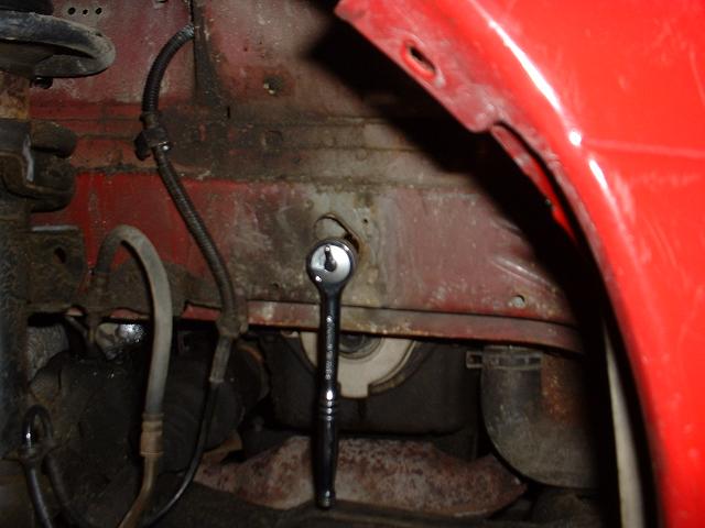 13. Remove the lower timing belt cover. There are 4 8mm bolts, but are they not the same length! Please keep track of what goes where! Where's that fourth bolt??? It's hidden out of view just above the timing marks on the lower cover, and can be accessed through this hole in the wheelwell.