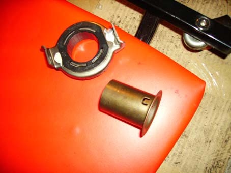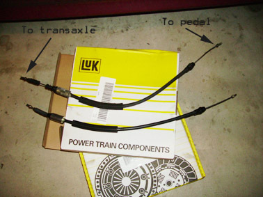 20. Unhook the reverse lamp switch from the top of the trans. 21. Loosen clutch cable. Have some one pull up on the clutch pedal and then pull the cable forward from the clutch fork. Gently release and let it hang out of the way. 22. If changing clutch cable: Refer to the 4 pictures below. Shield: ![]() Cables, old and new: