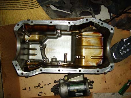 ![]() Baffle? removed, oil pan cleaned. Note oil level sensor and internal baffling: