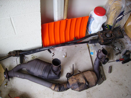 3. Raise car slightly (tires still touching the ground),and remove center caps from front wheels. Loosen all lugnuts and the 29mm axle nuts. 4. Raise car fully and then support it securely on jackstands. Raise high enough to clear the trans. Remove the wheel and axle nuts, remove front wheels and set them behind the jackstands. 5. Remove y-pipe. Remove the rear spring bolts and then place jack under the rear cat. Carefully remove the y-pipe nuts from the front and rear manifolds. Also remove the two bolts from the y-to-oil pan mount. Once loose, lower it carefully, it’s a bit heavy. 6. Remove the control arm-to –knuckle bolts. Get a crowbar and make sure the control arms are loose from the knuckles. Don’t remove at this point- they will come down with the subframe. 7. Remove the sway bar links from the strut. There is a hex on the other side of the bolt so you may hold with a wrench while you’re loosening. Tilt them out of the way. 8. Remove shifter. Remove the shift knob, the rod shifter support and shifter clevis pin, then the 2 bolts at rear of shifter and set it aside. You may need to remove the other 4 bolts if the exhaust is in the way. For the cable setup, remove clevis pin, take off the bracket with cables, then remove the cable support bracket. Let it hang out of the way. Pic 3: The parts pile will grow… ![]() 9. Loosen the steering rack and tie rod end bolts. Remove tie rod ends from the