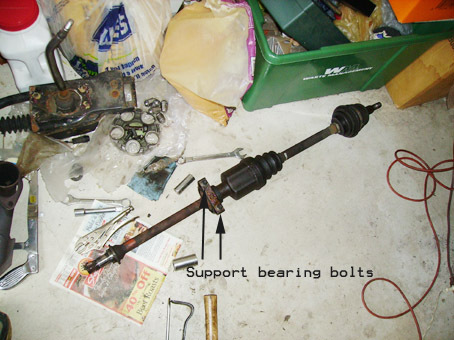 15. Remove CV joints from the hubs. Loosen the joints with a hammer, then pull/turn the hub to allow enough space to get the joints out. You may tie them temporarily so they don’t hang. 16. Remove the passenger side axle and link shaft as a unit. Place a pan under the trans to catch the fluid. You will need 2 people here. One needs to loosen the support bearing bolts (2) and the other holds and pulls the axle out. Keep holding it while the support bolts are out! There are no clips or anything holding the axle to the trans- it will (should) pull out easily. The driver side axle does not need to be removed. Pic 6: the axle and link shaft. ![]() 17. Remove the airbox, MAF, and air hose. Unhook the MAF and Air Temp sensors,