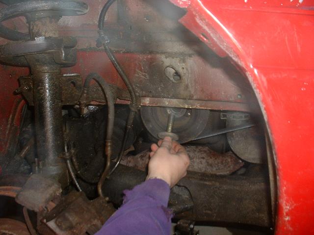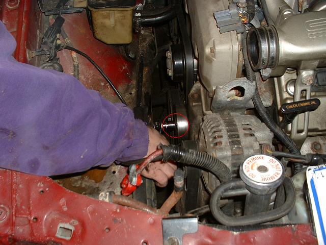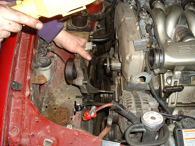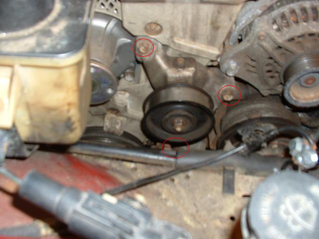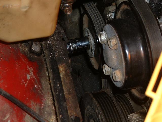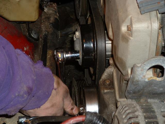 8. Before you take the next belt off, first remove the 4 12mm bolts holding the water pump pulley on. You need the belt on to do this, otherwise the pulley will just spin! Another option is to use a strap wrench after the belt has been removed.
