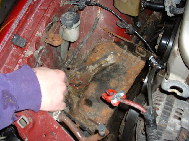 4. Remove battery and battery tray. Remove the 8mm bolt in the bottom of the tray (you can see I broke mine off).