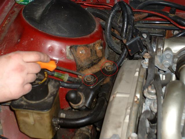 6. Remove engine roll damper. There are two 13mm bolts holding it to the bracket, 3 13mm nuts holding the bracket to the strut tower, and two 10mm bolts attaching the bottom of the damper to the block. First remove the damper itself, then the bracket. First remove the 8mm bolt holding the power steering reservoir down. This way you can move it as you need to to give yourself more room.