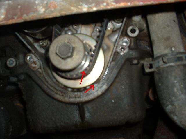 Then check and make sure that the dot on the timing belt pulley lines up with this line. The dot is not visible in the pic, but it looks like the one above. If this doesn't line up, then rotate the crank all the way around again. This time all three should line up correctly.