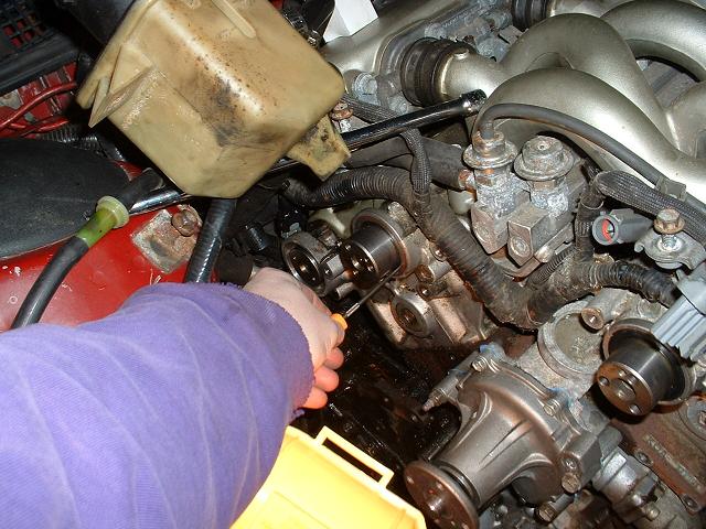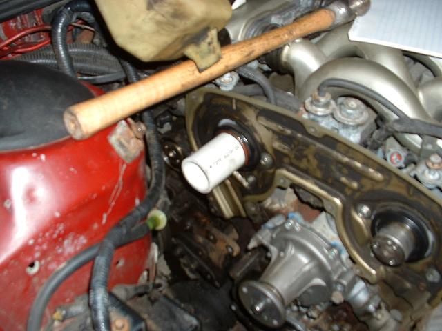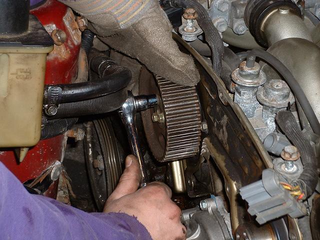 17. Remove the timing belt pulley. If you haven't removed the crank bolt yet, do it now. You'll need to put the car in 5th gear and have an assistant stand on the brakes to prevent the engine from spinning. Alternately, use a strap wrench (especially for the ATX) Sometimes this will slide right off, but