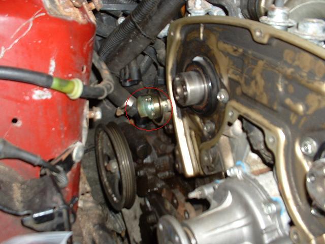 If the CPS won't come out, it's stuck on one of the metal vanes from the timing belt pulley. You'll have to reinstall the crank bolt to turn the crank until the CPS is free or put the crank damper back on a little bit and grasp it firmly with both hands (make sure the car is in neutral or else this won't be easy. Alternately, you can disconnect the CPS from the middle timing belt cover (next step) and then remove it later after you take off the timing belt sprocket. Ignore the arrows in this pic for this step.